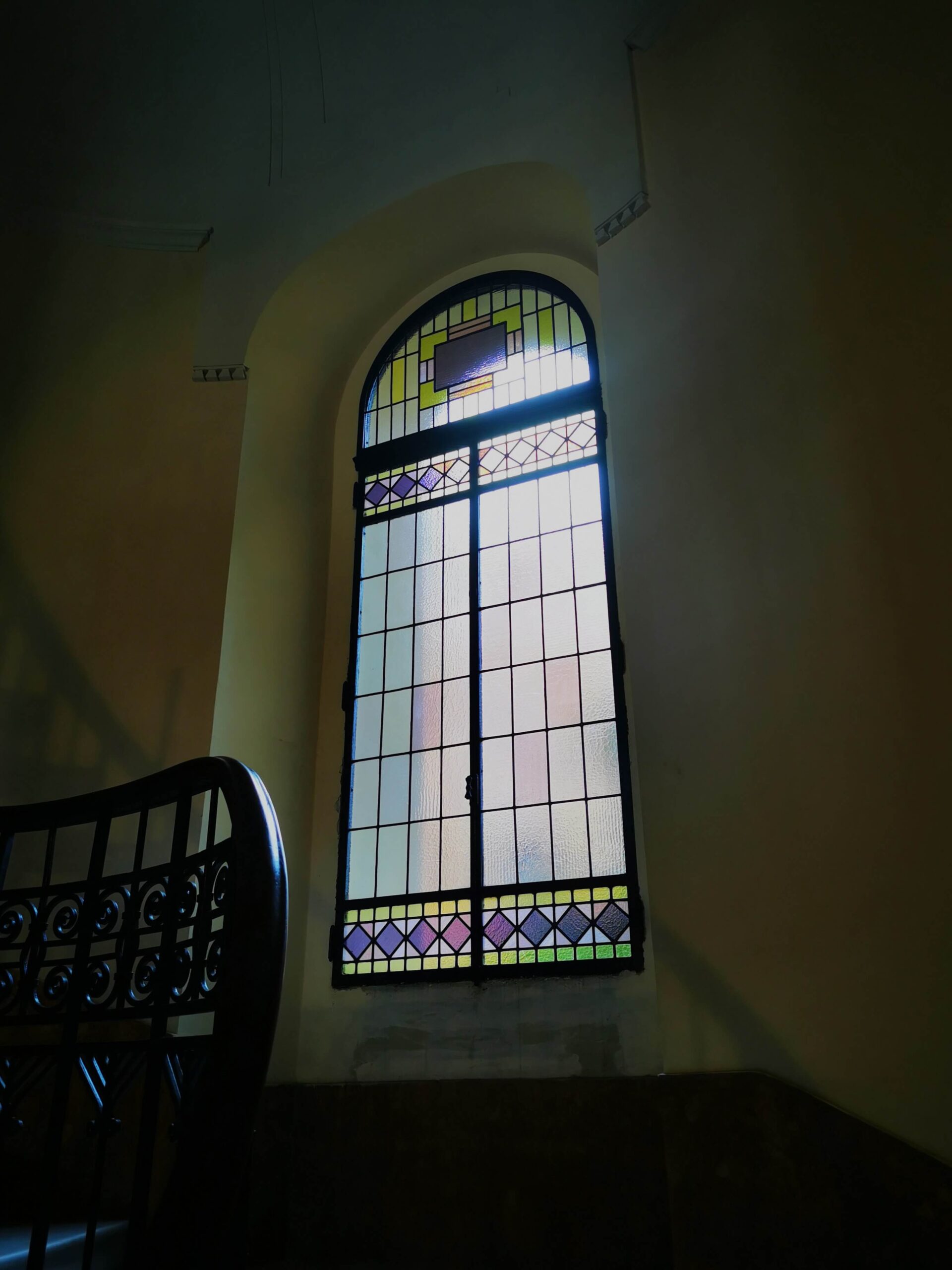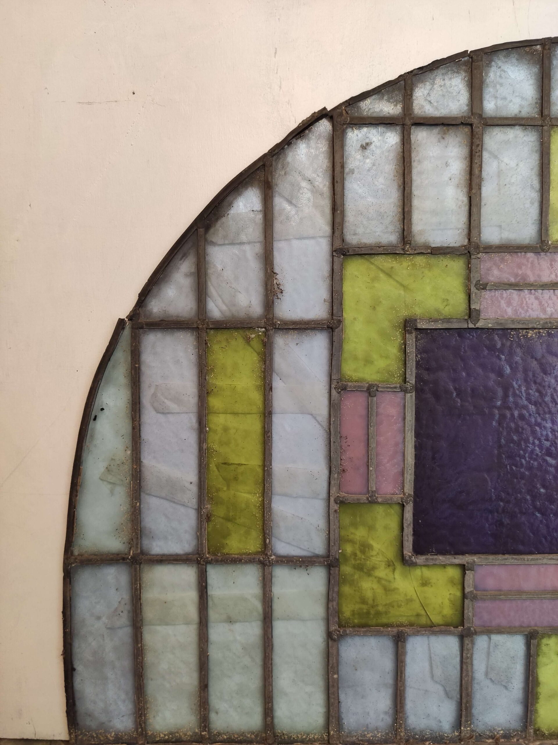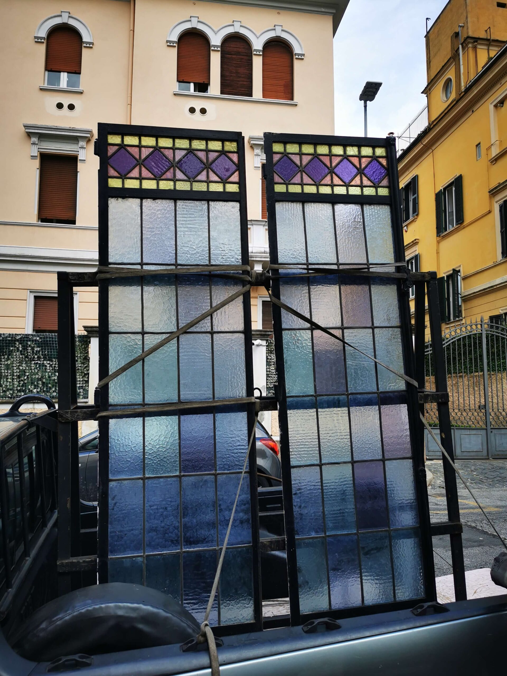 All’interno di un villino d’epoca nei pressi di Villa Torlonia, la vetrata posizionata sulla scala si caratterizza per le linee geometriche e i colori di tonalità insolite.