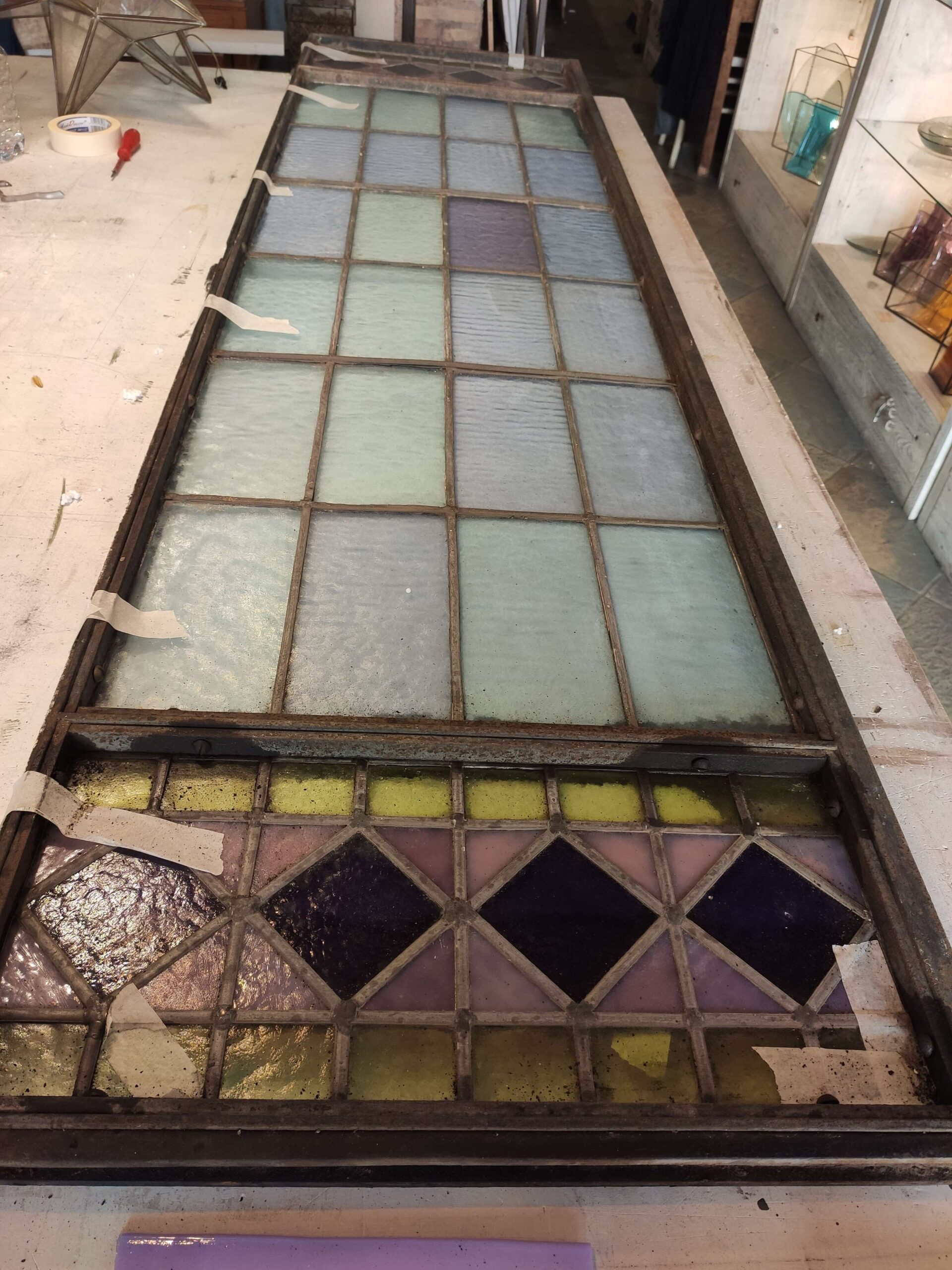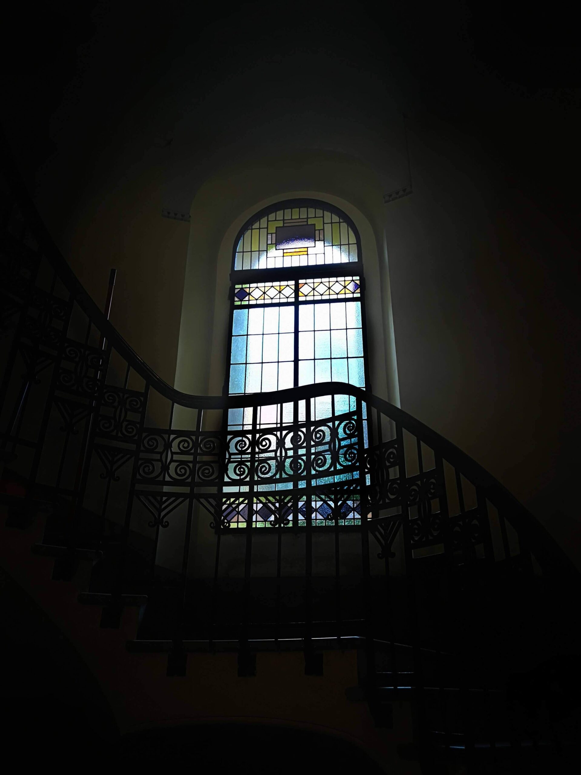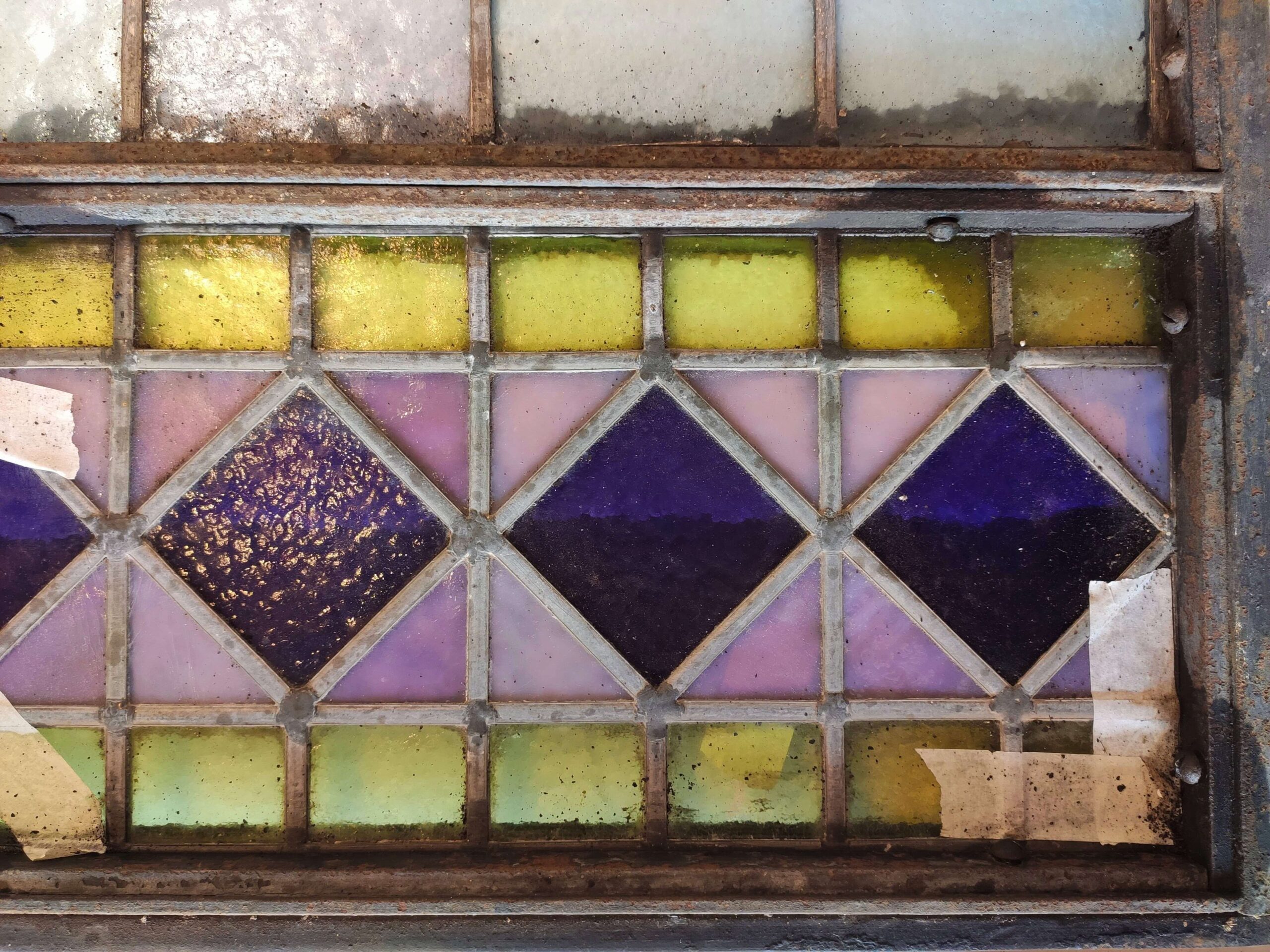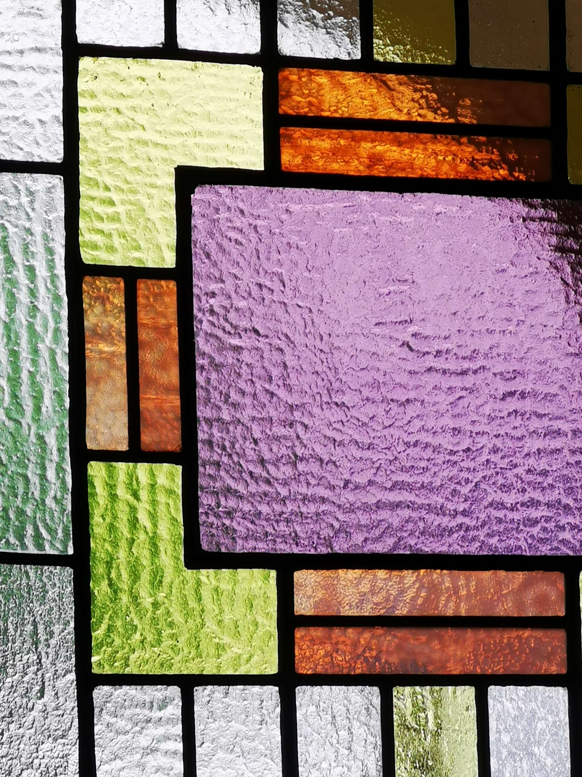 All’interno di un villino d’epoca nei pressi di Villa Torlonia, la vetrata posizionata sulla scala si caratterizza per le linee geometriche e i colori di tonalità insolite.