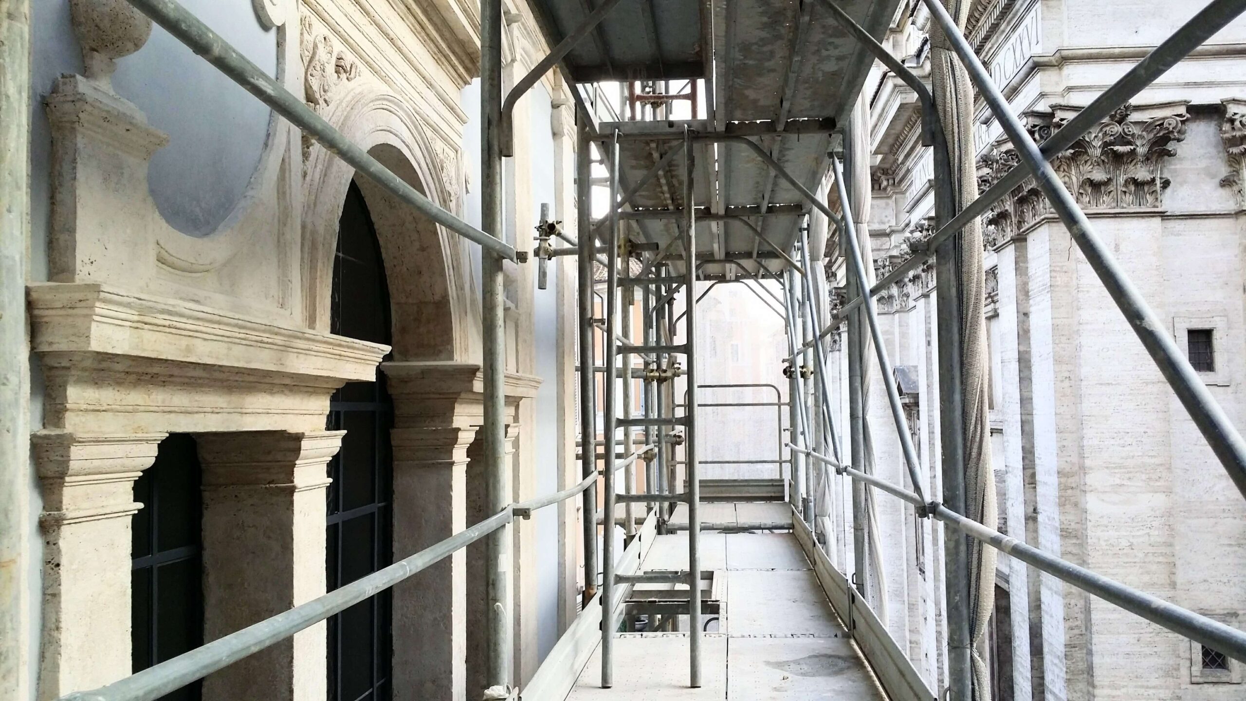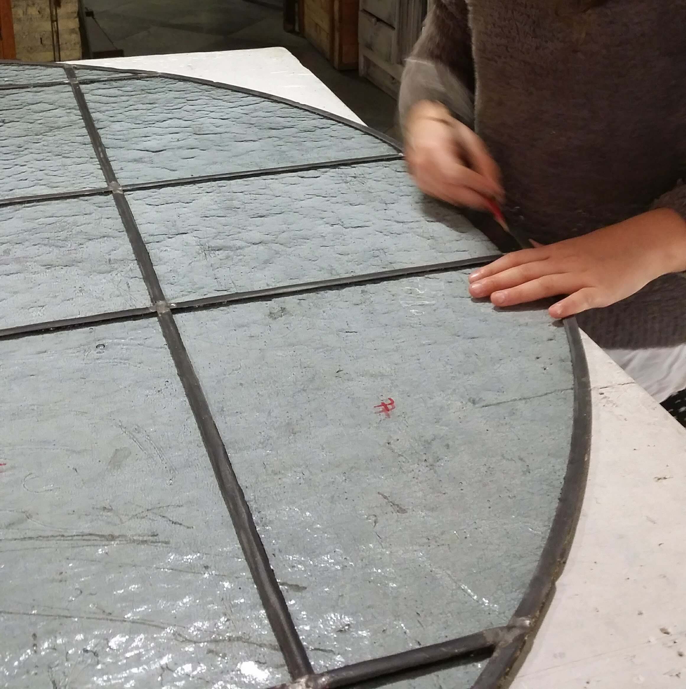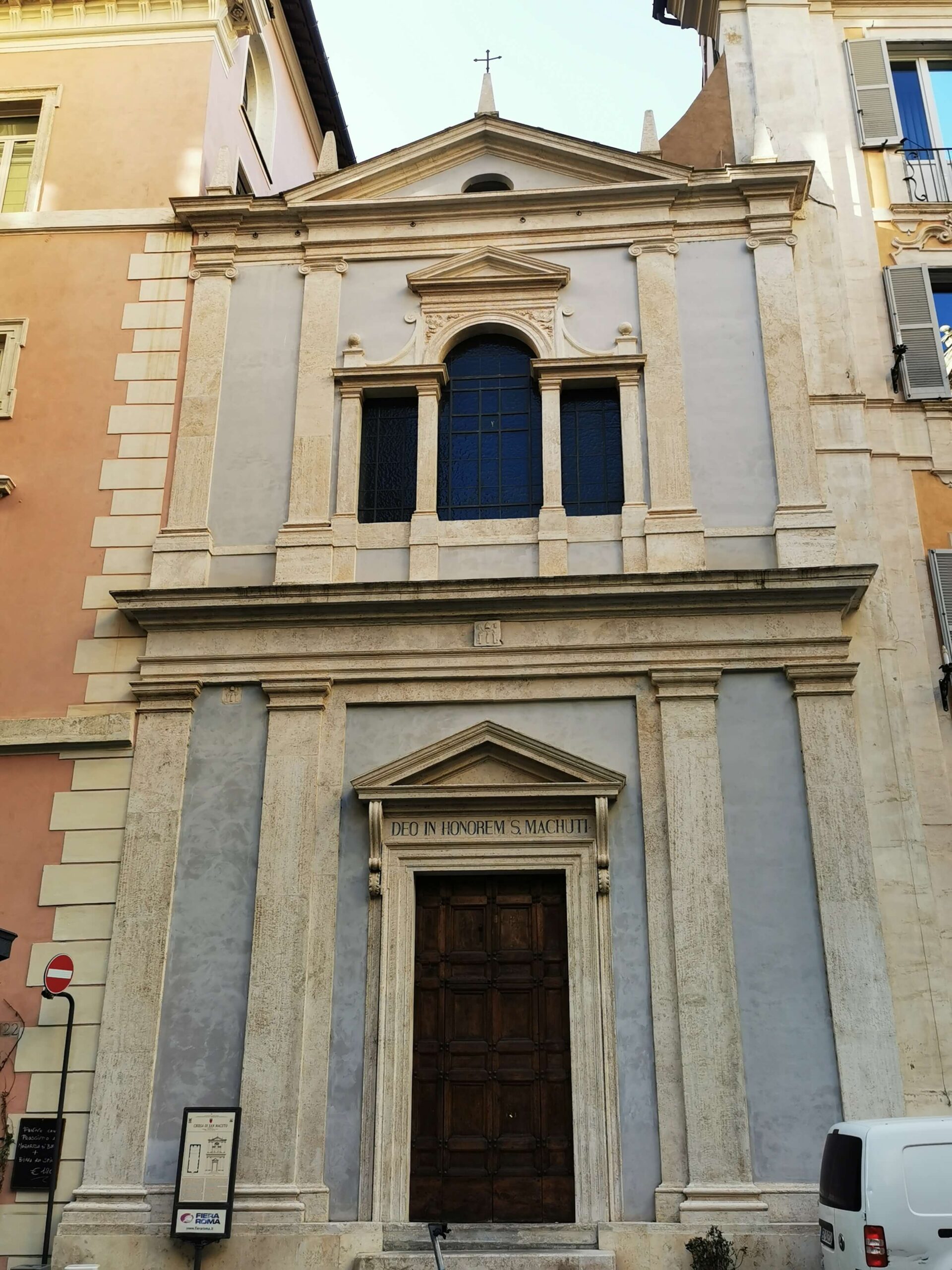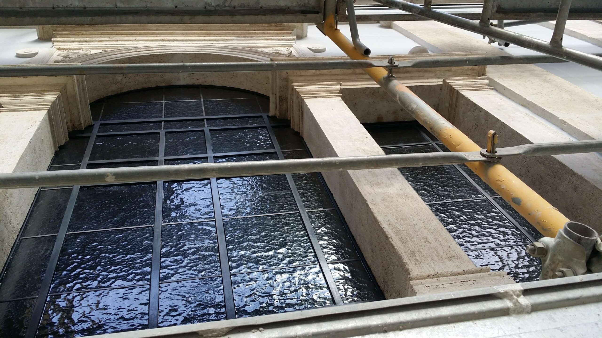 Durante l’intervento di restauro della facciata della Chiesa di San Macuto è stata realizzata ex novo tutta la vetrata, utilizzando pannelli monocromatici di vetro cattedrale legato a piombo in tecnica tradizionale.