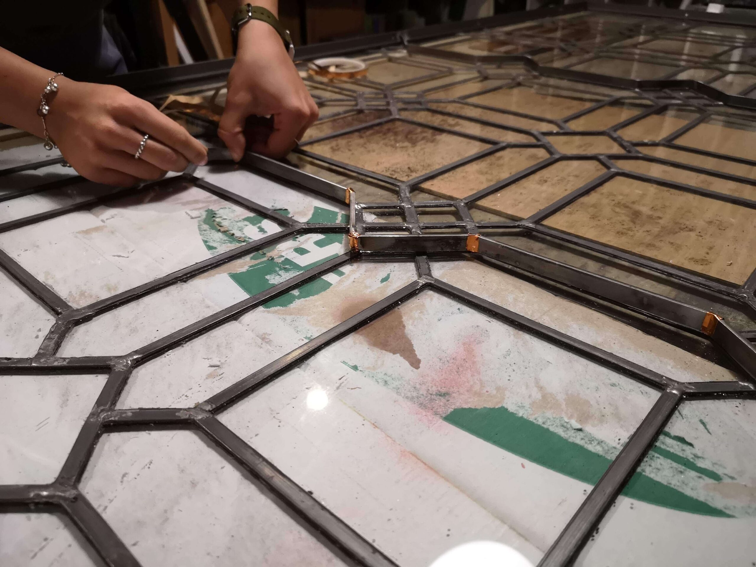 La vetrata è stata adagiata di piatto e con una lieve pressione sui piombi, riposizionata in piano.