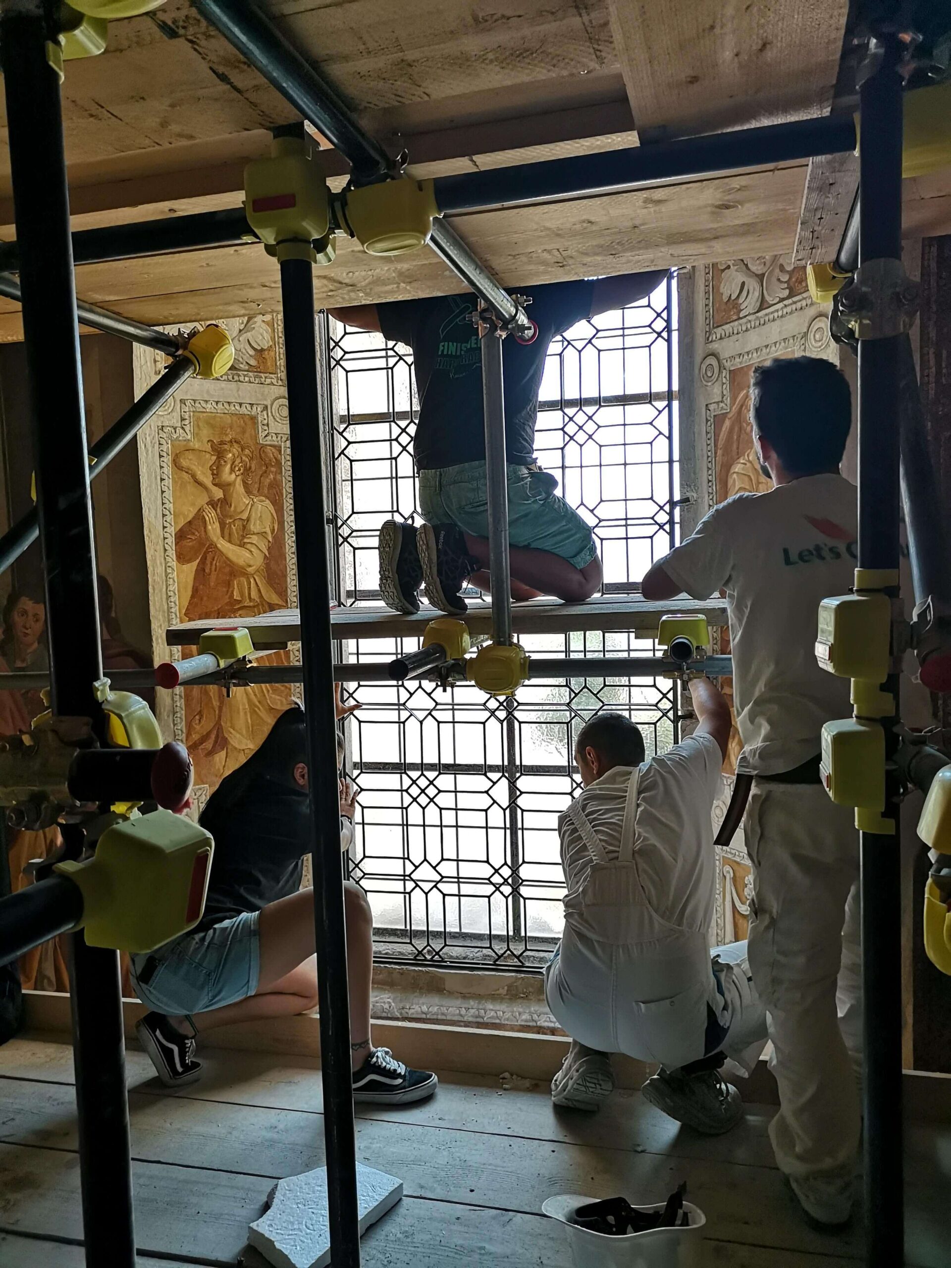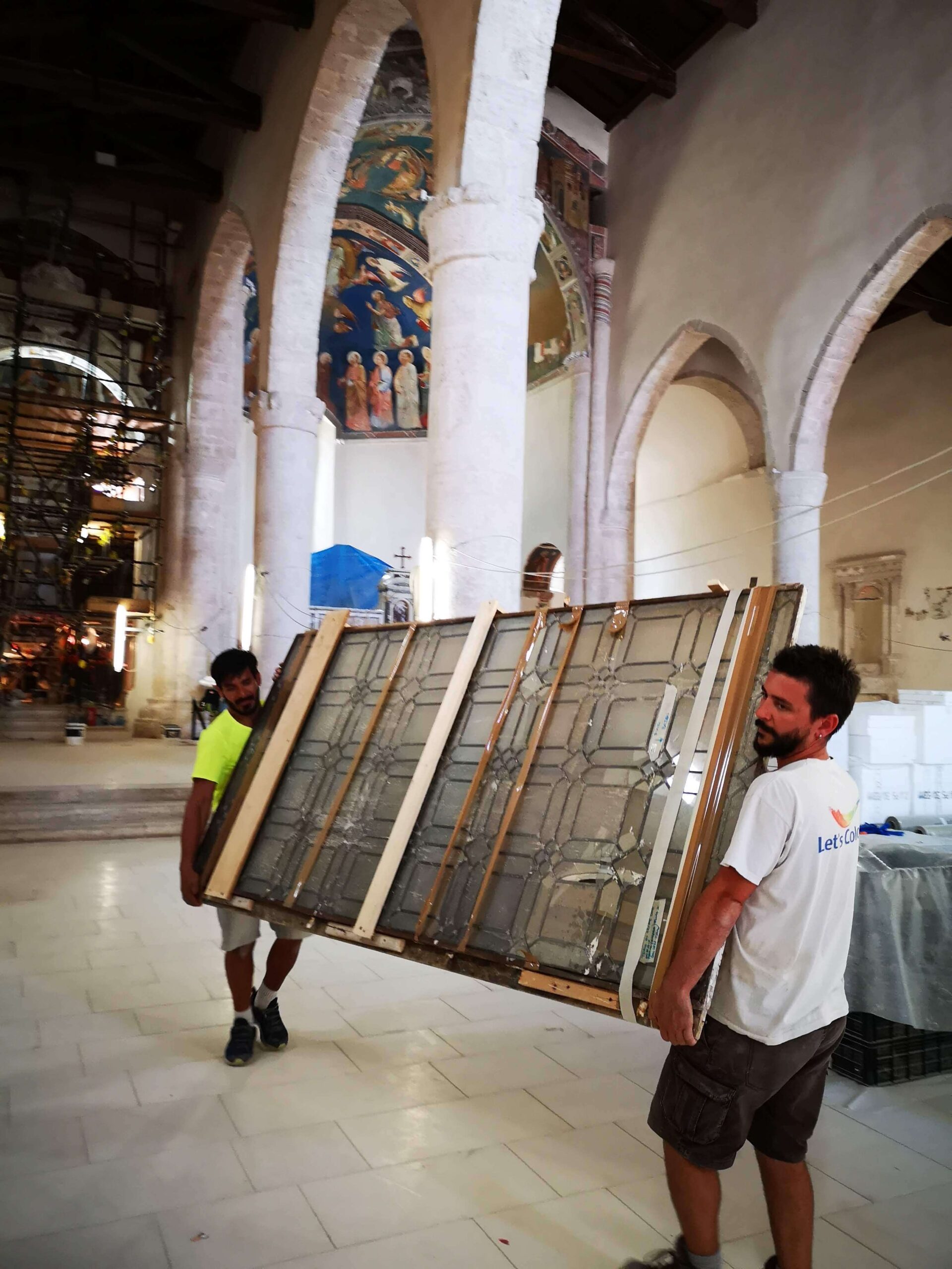 Successivamente ad una messa in sicurezza dei frammenti di vetro pericolanti, la vetrata è stata rimossa dalla sua sede compresa di telaio in ferro perimetrale e, adeguatamente sostenuta con supporti in legno, trasportata in laboratorio.