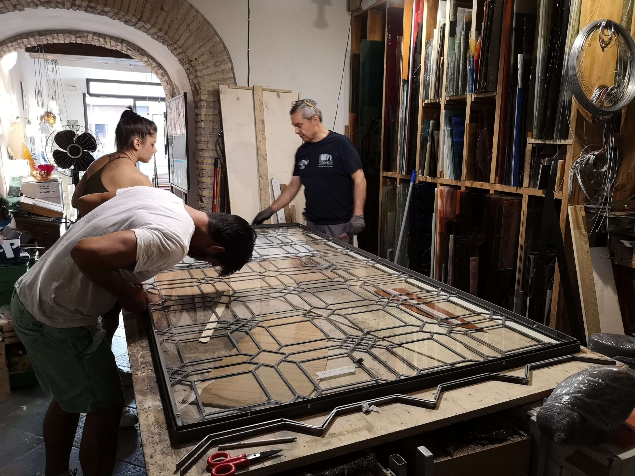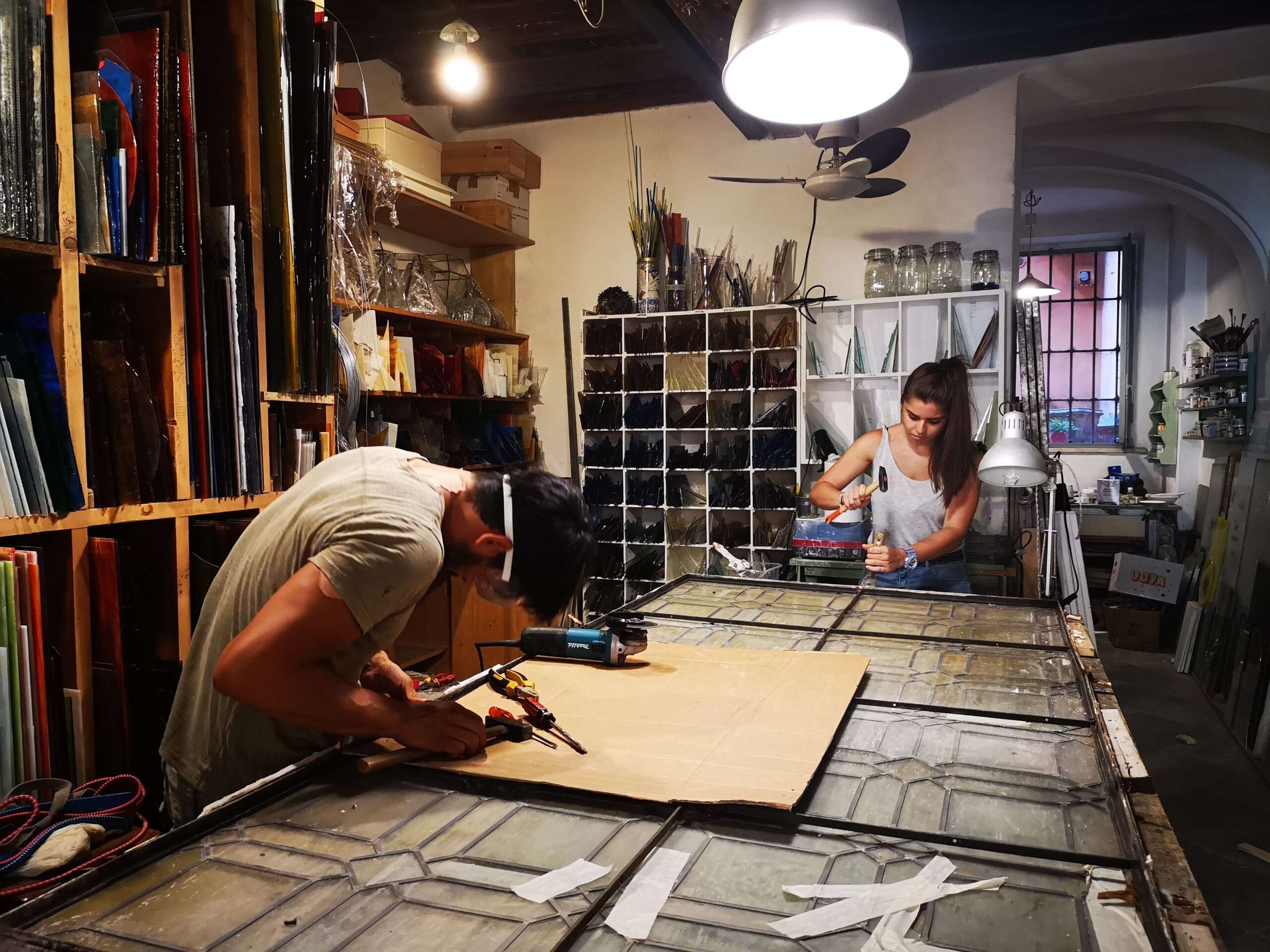 Lo stucco è un fondamentale legante tra vetri e piombo: inserendosi nelle intercapedini, consolida la struttura rendendo un corpo unico e compatto, resistente nel tempo.