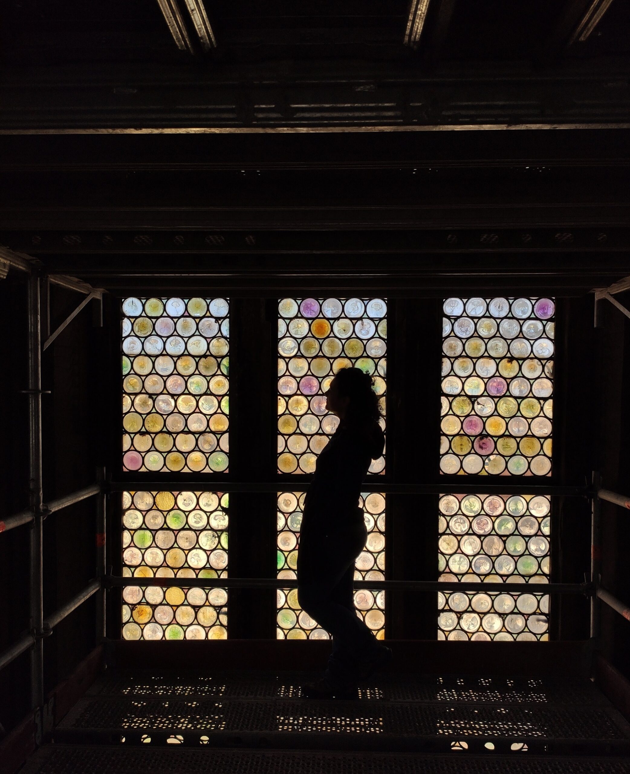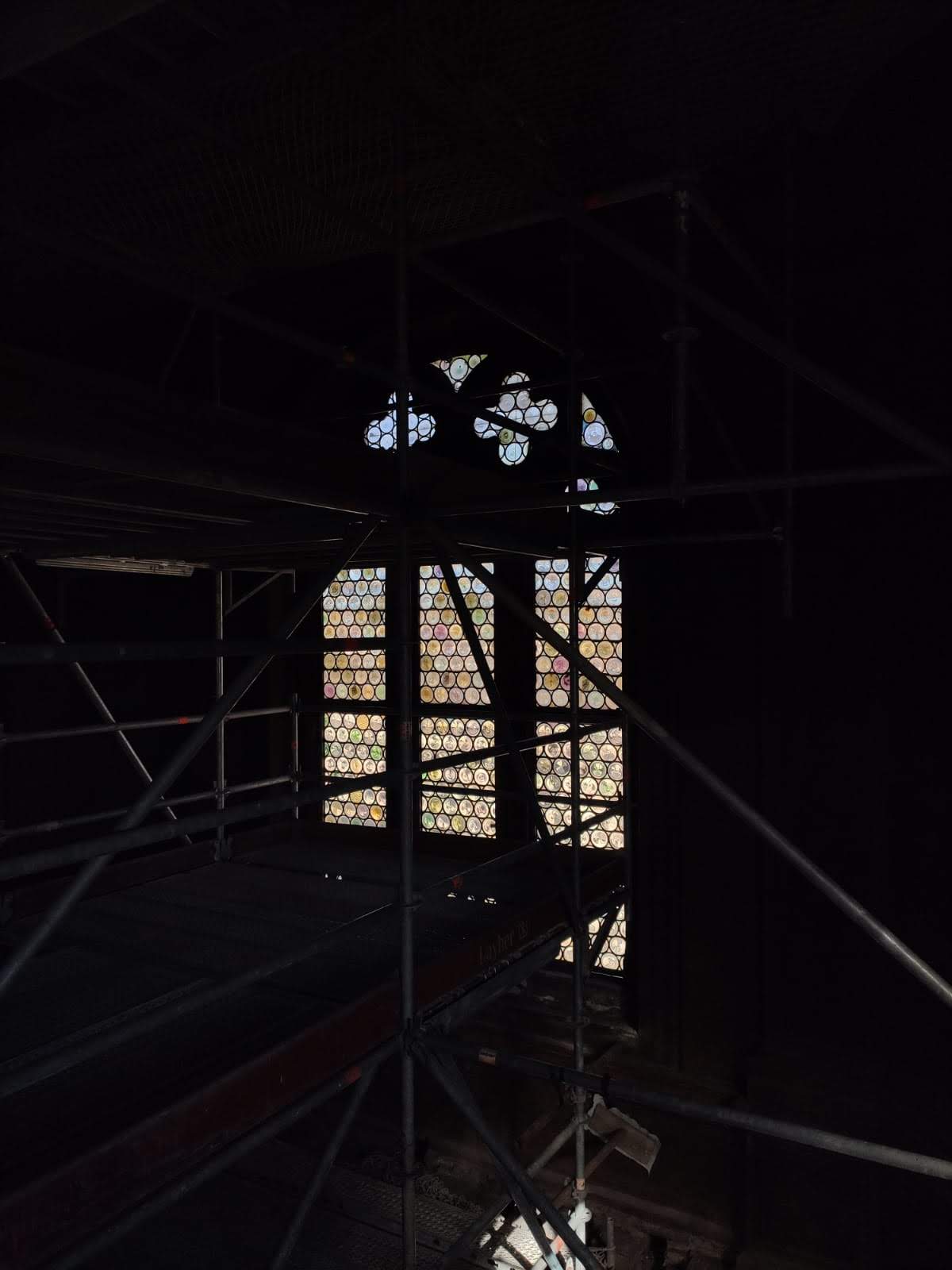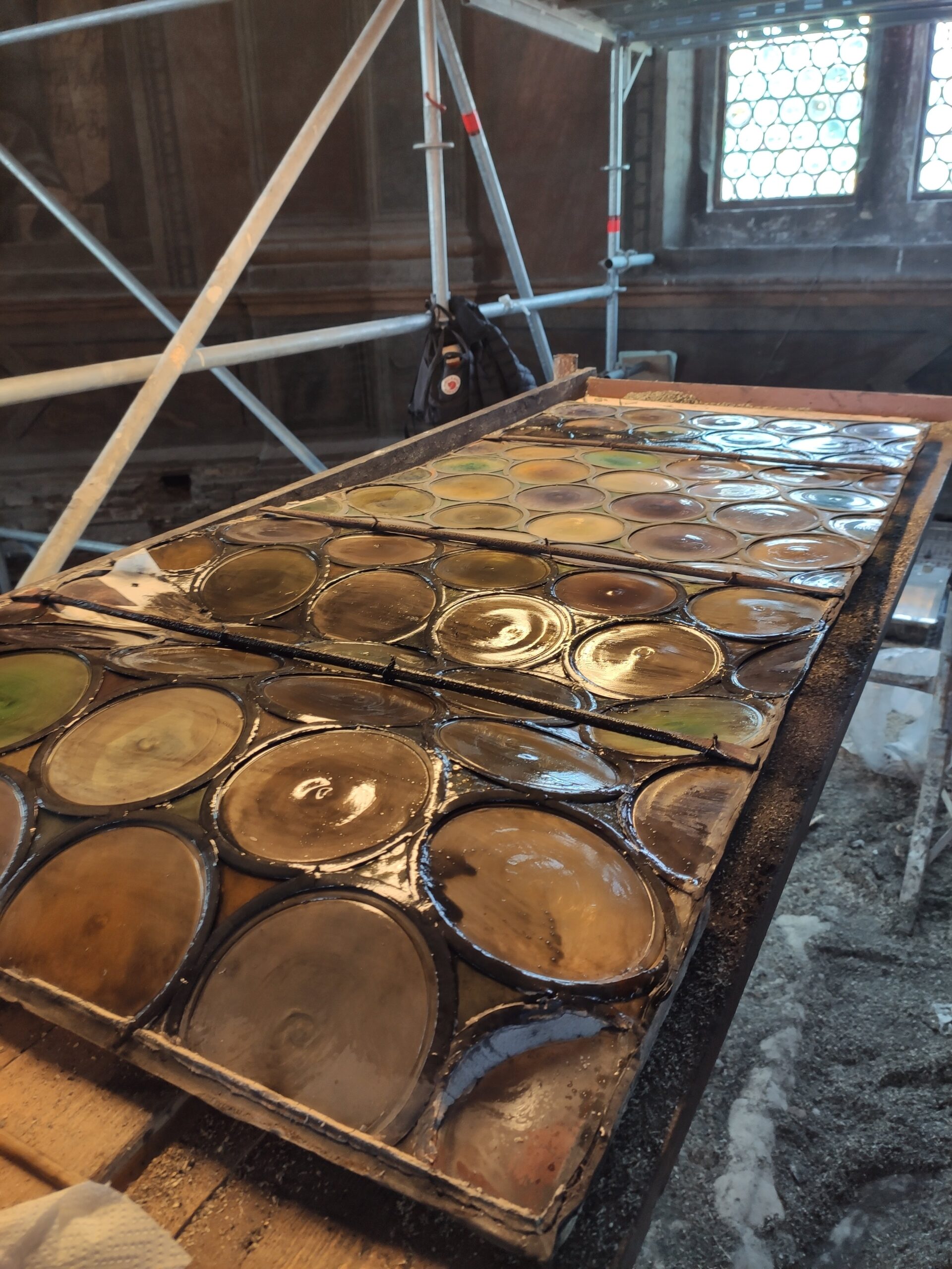 Un altro intervento all’interno del Complesso Monumentale ha interessato le vetrate delle trifore del Tiburio. I vetri soffiati di forma circolare (detta “a rullo”) sono stati recuperati e la struttura in piombo consolidata.