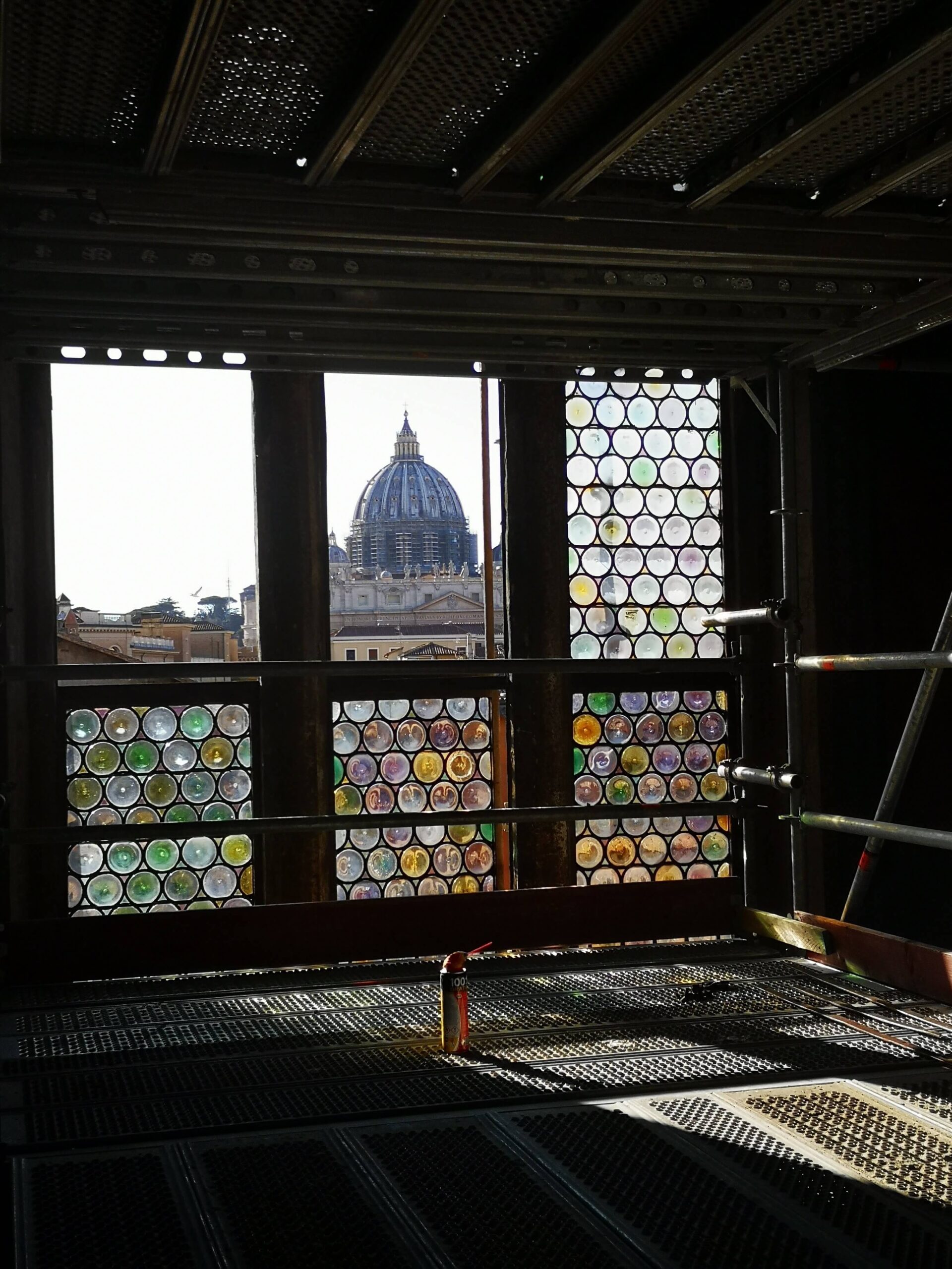 Il restauro a cura del nostro Studio è stato di tipo conservativo sulle vetrate delle finestre delle Corsie Sistine, sostituendo le tessere rotte con nuovi tasselli di vetro soffiato a bocca in conformità agli originali.