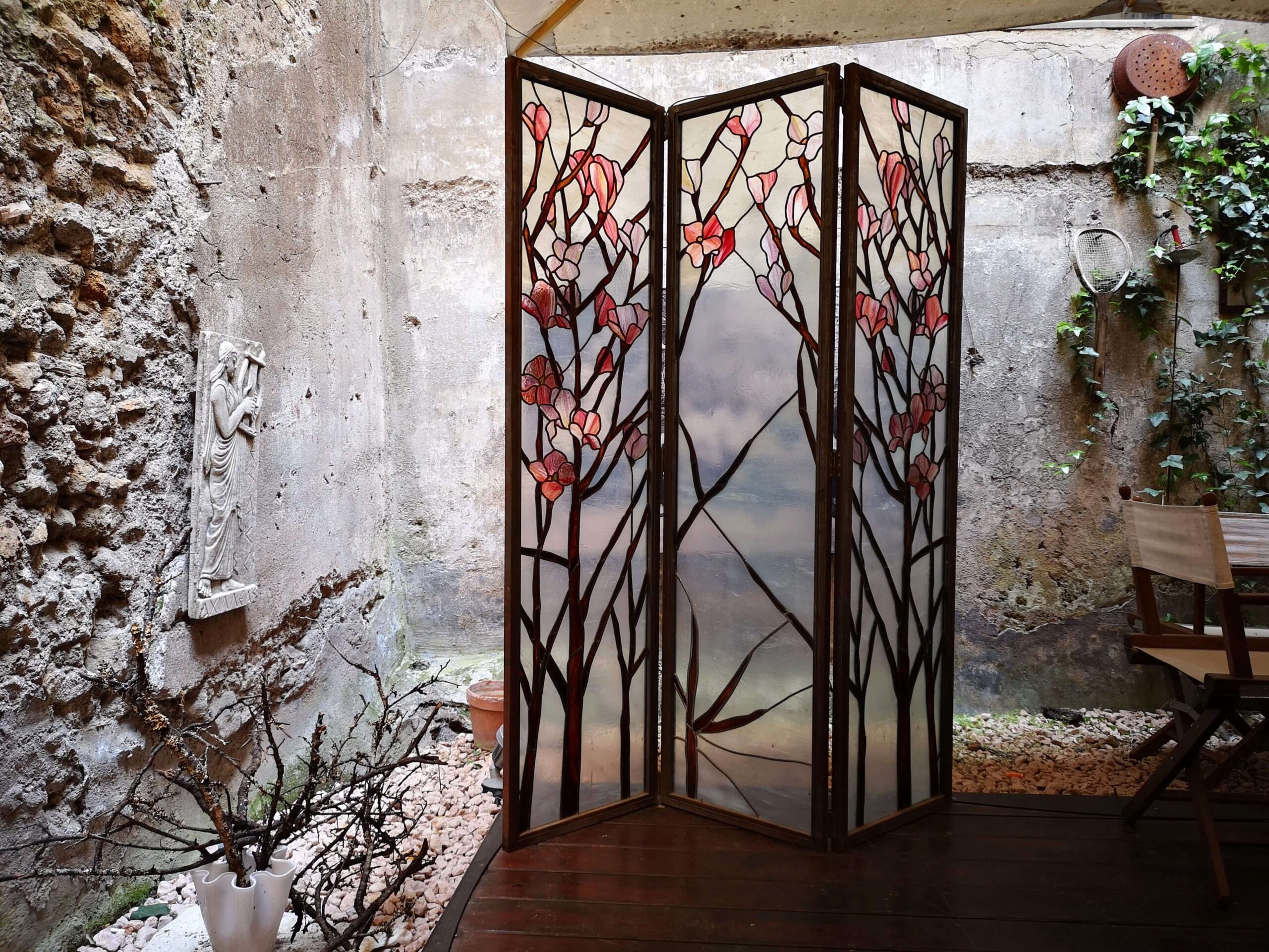 Vetrata artistica progettata e realizzata interamente a mano secondo la tecnica tradizionale della tessitura a piombo.