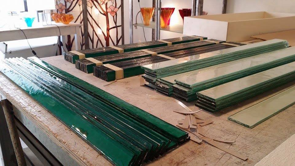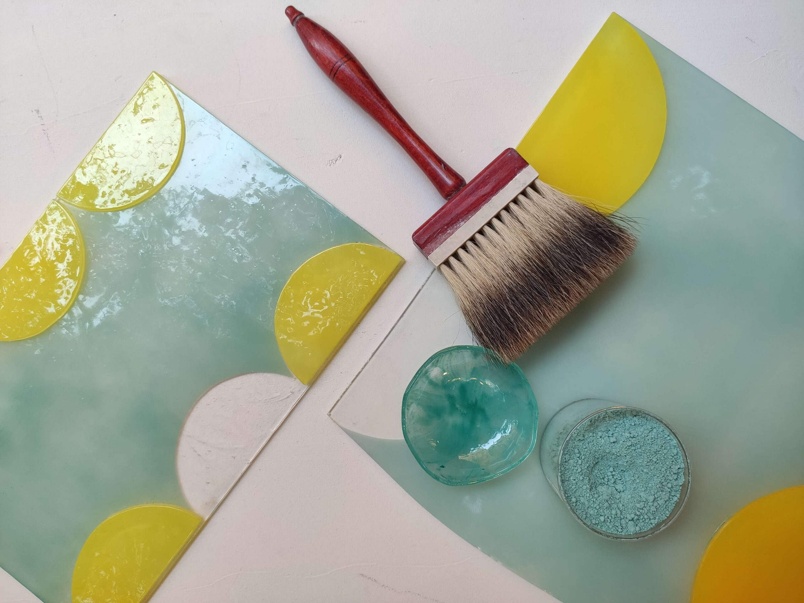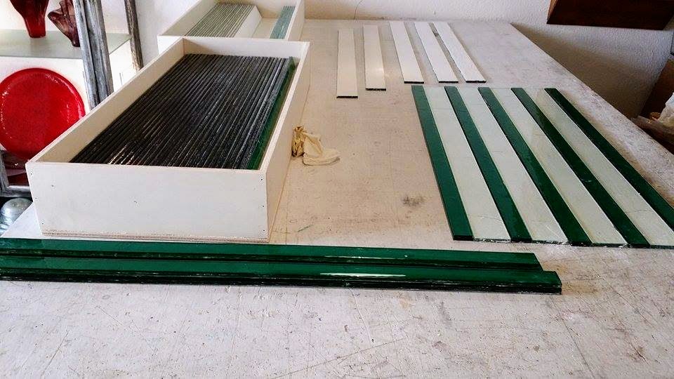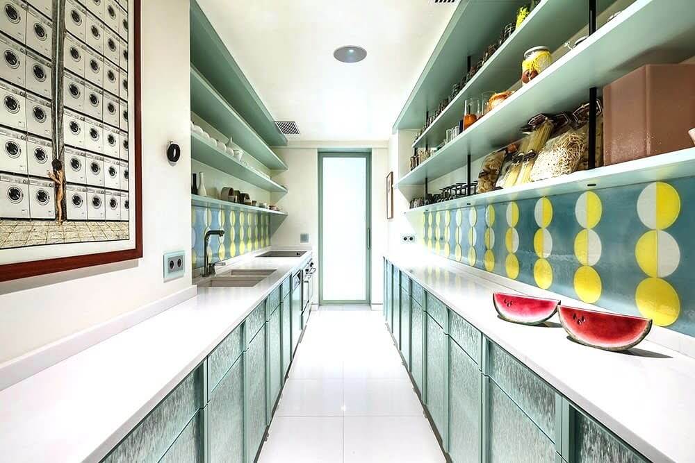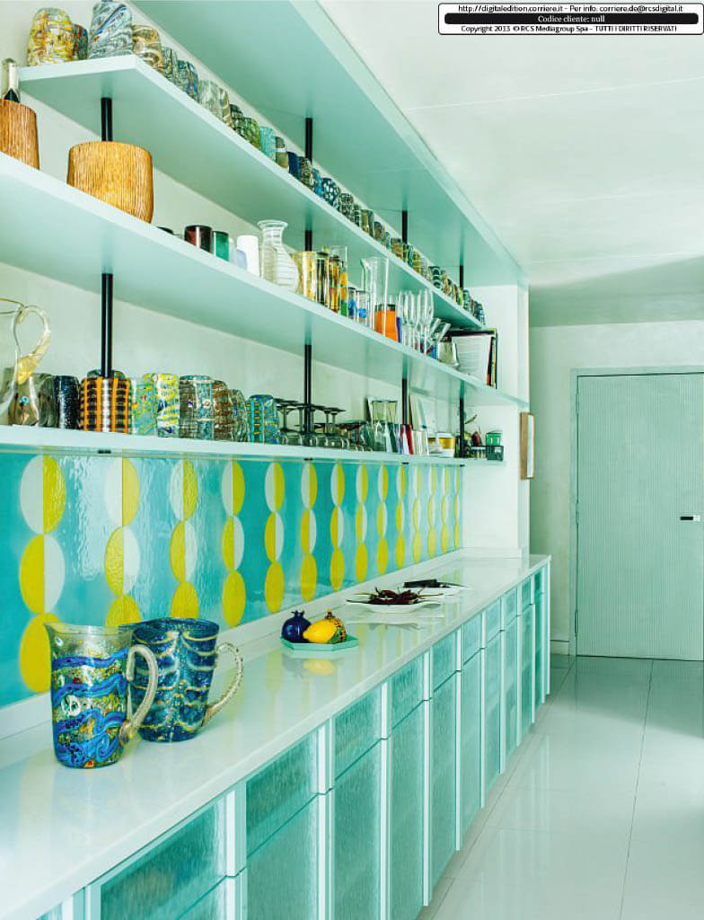 Rivestimenti in vetrofusione realizzati in esclusiva per la cucina della casa a Montecarlo della collezionista d’arte contemporanea Nicoletta Fiorucci, su progetto dell’architetto Annarita Aversa.