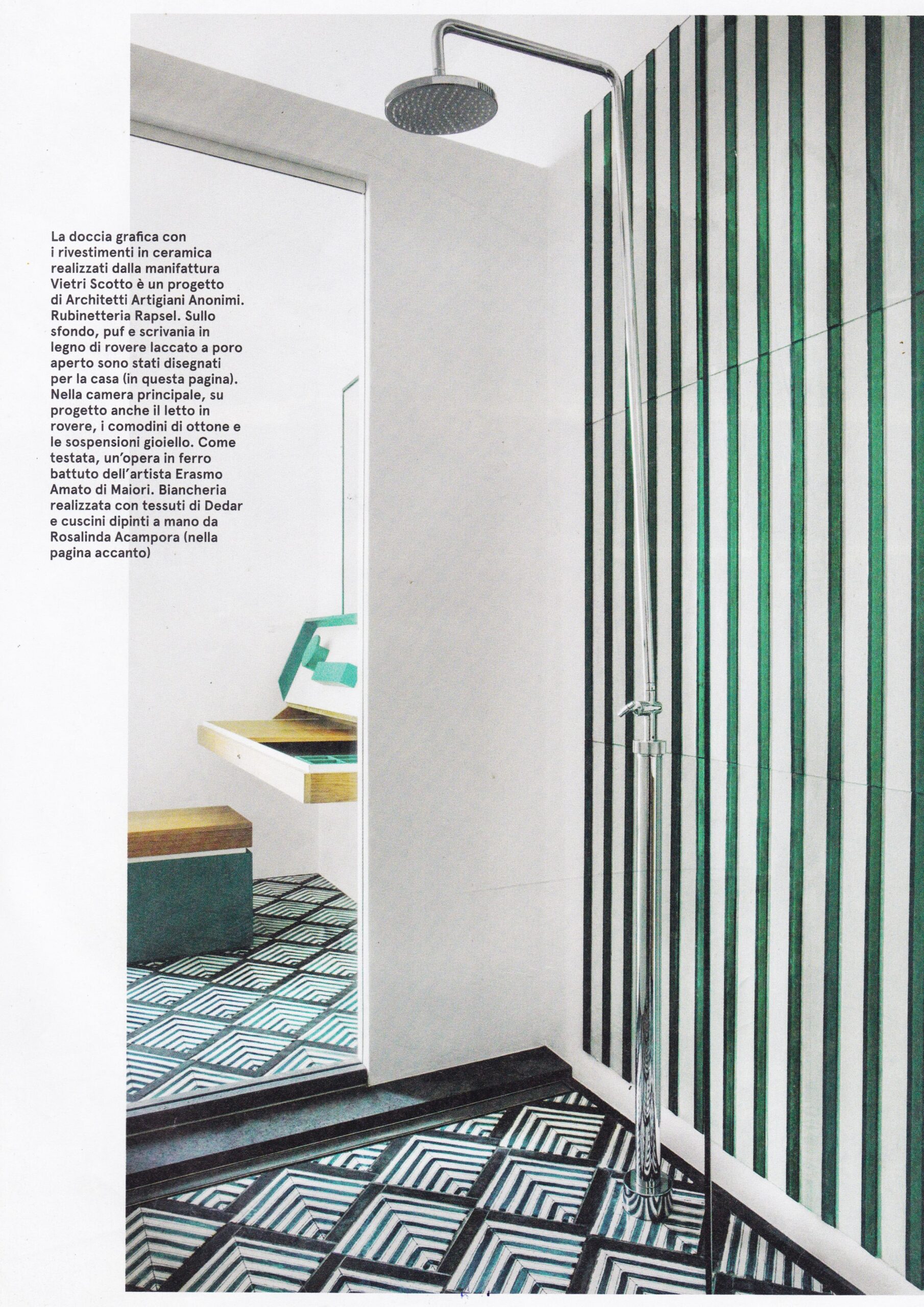 Nel cuore della Costiera amalfitana, i lavori del nostro Studio si sono inseriti in un contesto mediterraneo e contemporaneo, su progetto dell’architetto Annarita Aversa. I rivestimenti in vetrofusione sono realizzati in esclusiva per la parete doccia: le linee parallele verticali creano un effetto grafico e il verde riprende il pavimento in ceramica di Vietri, in un’armonia di toni e materiali.