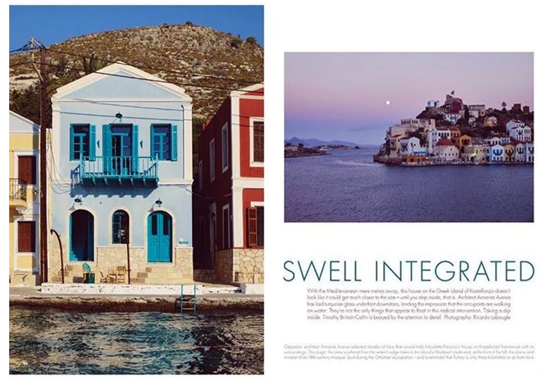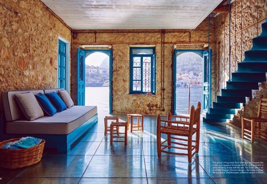 Nell’isola greca di Kastellorizo, la casa di Nicoletta Fiorucci è incastonata tra il blu cobalto dell’Egeo e il verde della macchia mediterranea.